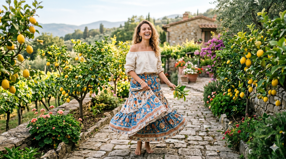 Doğal boyalarla renklendirilmiş, kat kat tasarımıyla İtalyan kasabalarının rustik havasını yansıtır. Pamuklu astarı sayesinde iç göstermez, dökümlü durur.