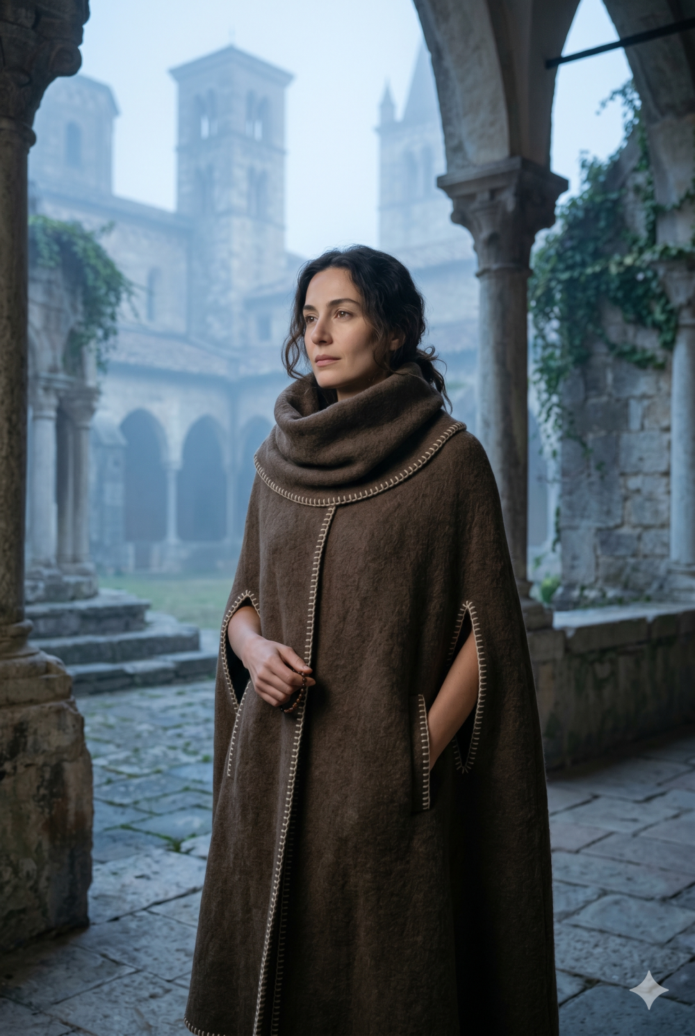 İtalyan rustik stilinin vazgeçilmezi olan panço kesimi, kenarlarındaki dikiş detayları ve ağır dökümüyle kışlık dış giyime sanatsal bir dokunuş getiriyor.