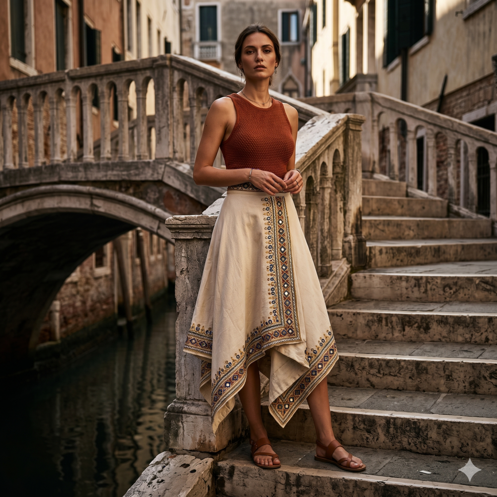 Etek ucundaki el işçiliği görünümlü etnik nakışları ve asimetrik kesimiyle sıradanlıktan uzak, tamamen özgün bir tasarım. Ham pamuk dokusuyla dört mevsim kullanıma uygundur.