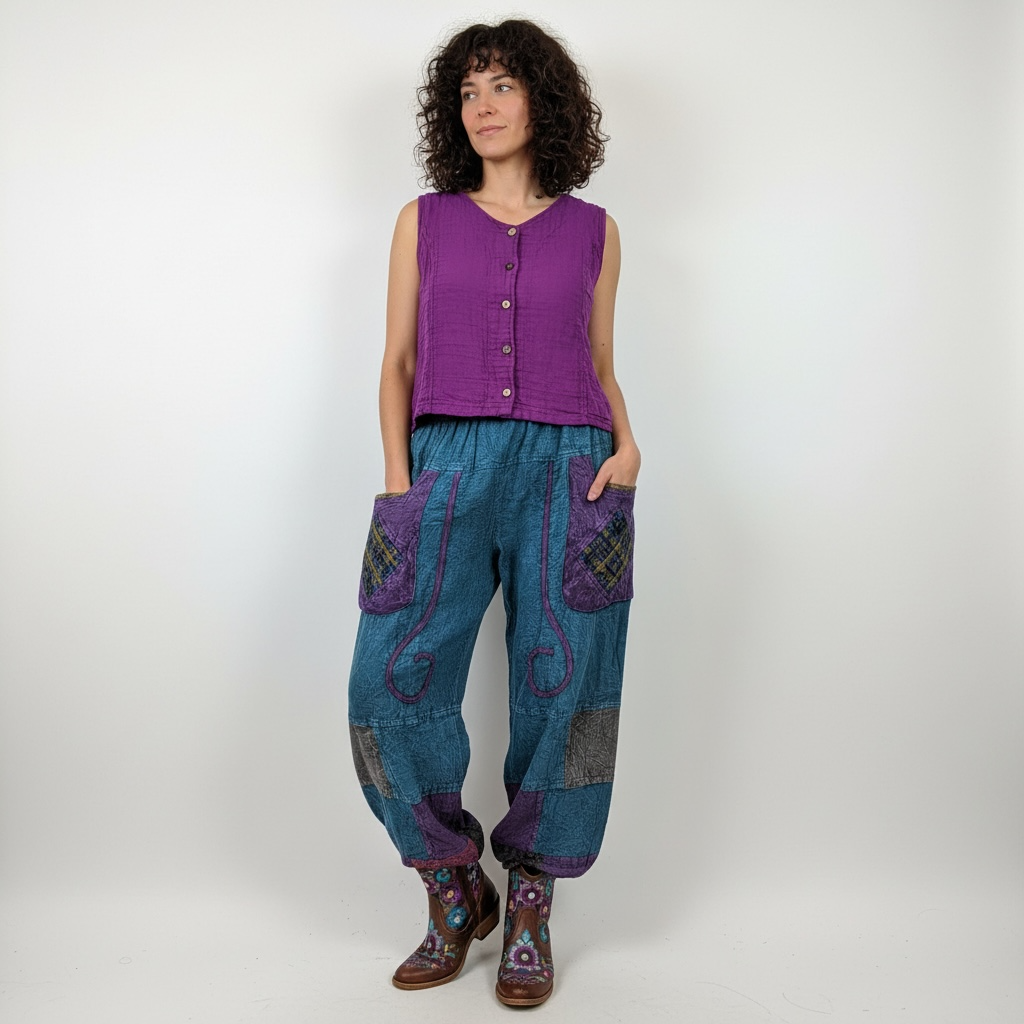 Geleneksel dokuları modern ve bohem bir tarzla birleştiren bu özel set, konforundan ödün vermeyen kadınlar için tasarlandı. Doğal dokulu kumaşıyla nefes alan düğmeli cepken yelek, özel nakış işlemeleri ve patchwork (yama) detaylarıyla hareket kazanan şalvar pantolon ile mükemmel bir uyum yakalıyor. Hem günlük hayatta hem de özel buluşmalarda özgün tarzınızı yansıtacak bu kombin, gardırobunuzun en favori parçası olmaya aday!